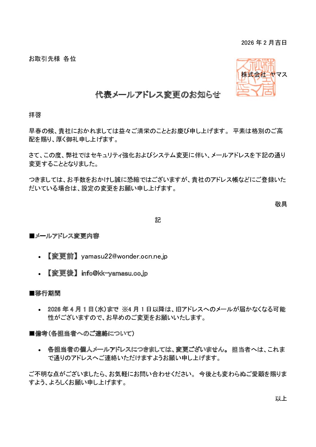 代表メールアドレス変更のお知らせ